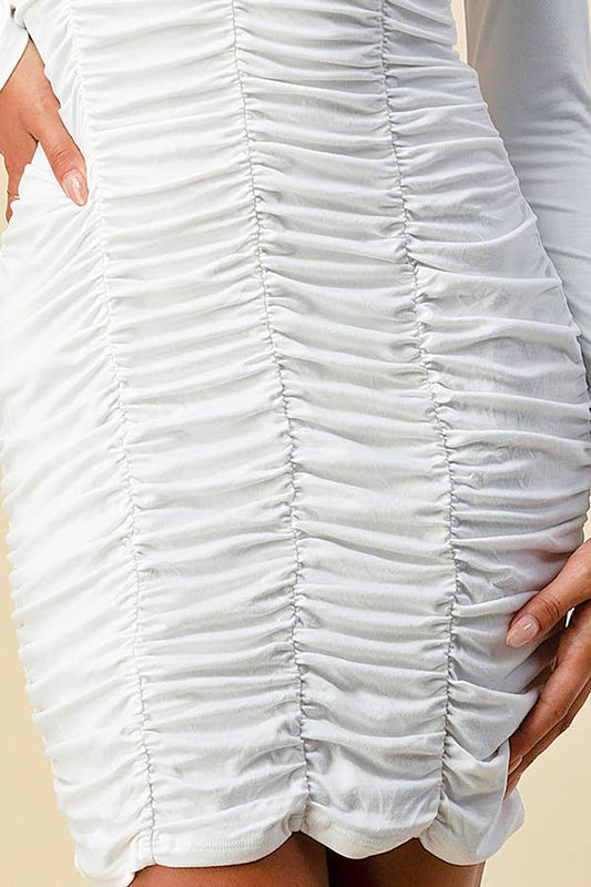RUCHED MOCK NECK LONG SLEEVE MINI DRESS