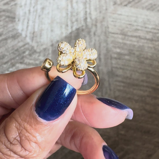 A little sparkle, a little movement, and a whole lot of style. The Flower Glow Spinning Ring features an elevated clover design with a shimmering diamond pavé cluster that spins, adding a playful yet elegant touch to your look. Finished in tarnish-free gold plating, it’s made for everyday wear without the worry. With a one-size adjustable fit, this ring comfortably adapts to you — no sizing stress, just effortless style.