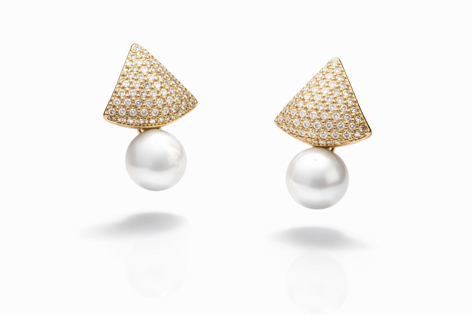 Elevate your everyday elegance with these statement pearl drop earrings designed to balance modern geometry and timeless luxury. Featuring a pavé-set triangular top finished in radiant gold plating, each earring is anchored by a luminous pearl that adds effortless sophistication.