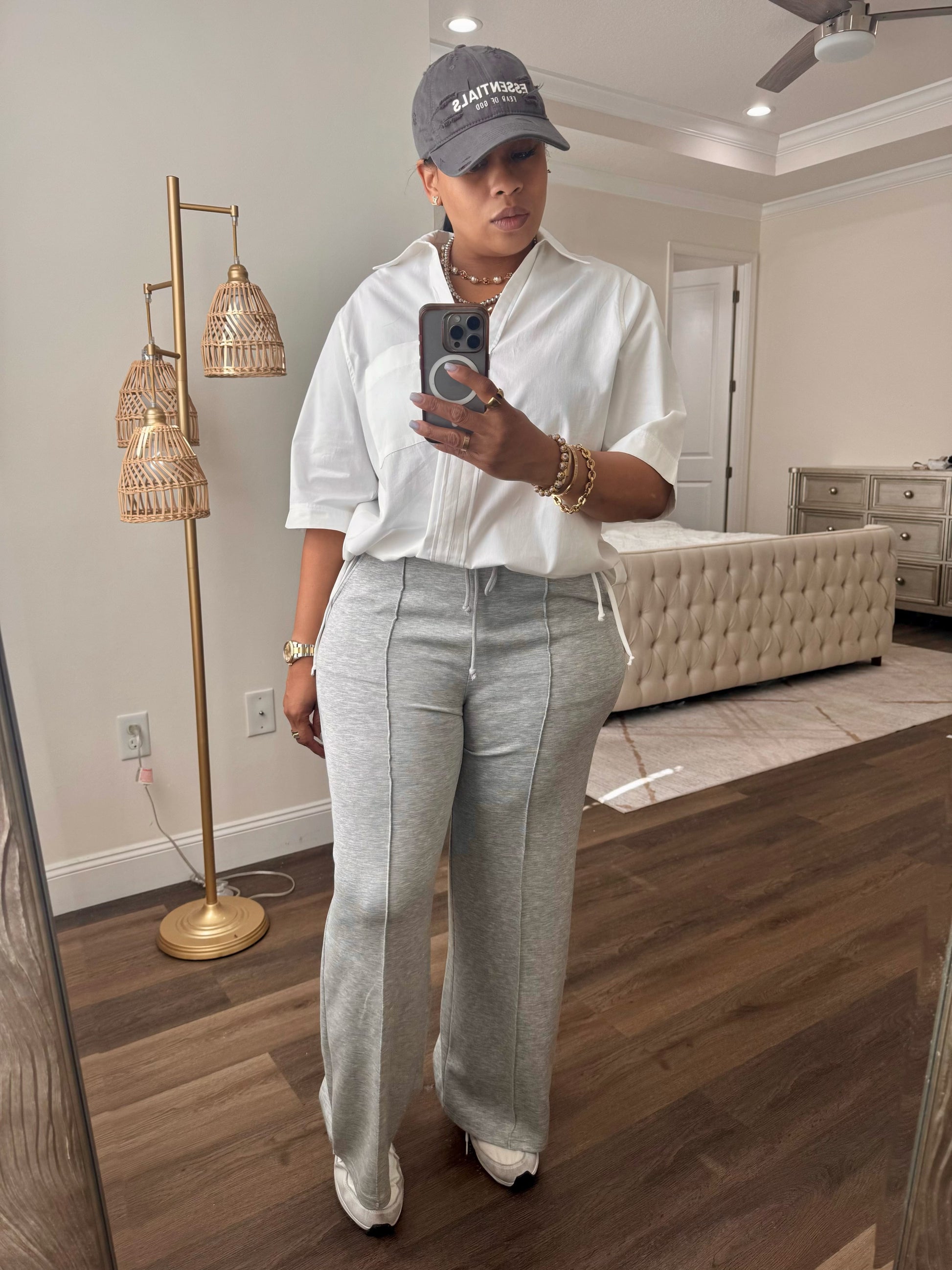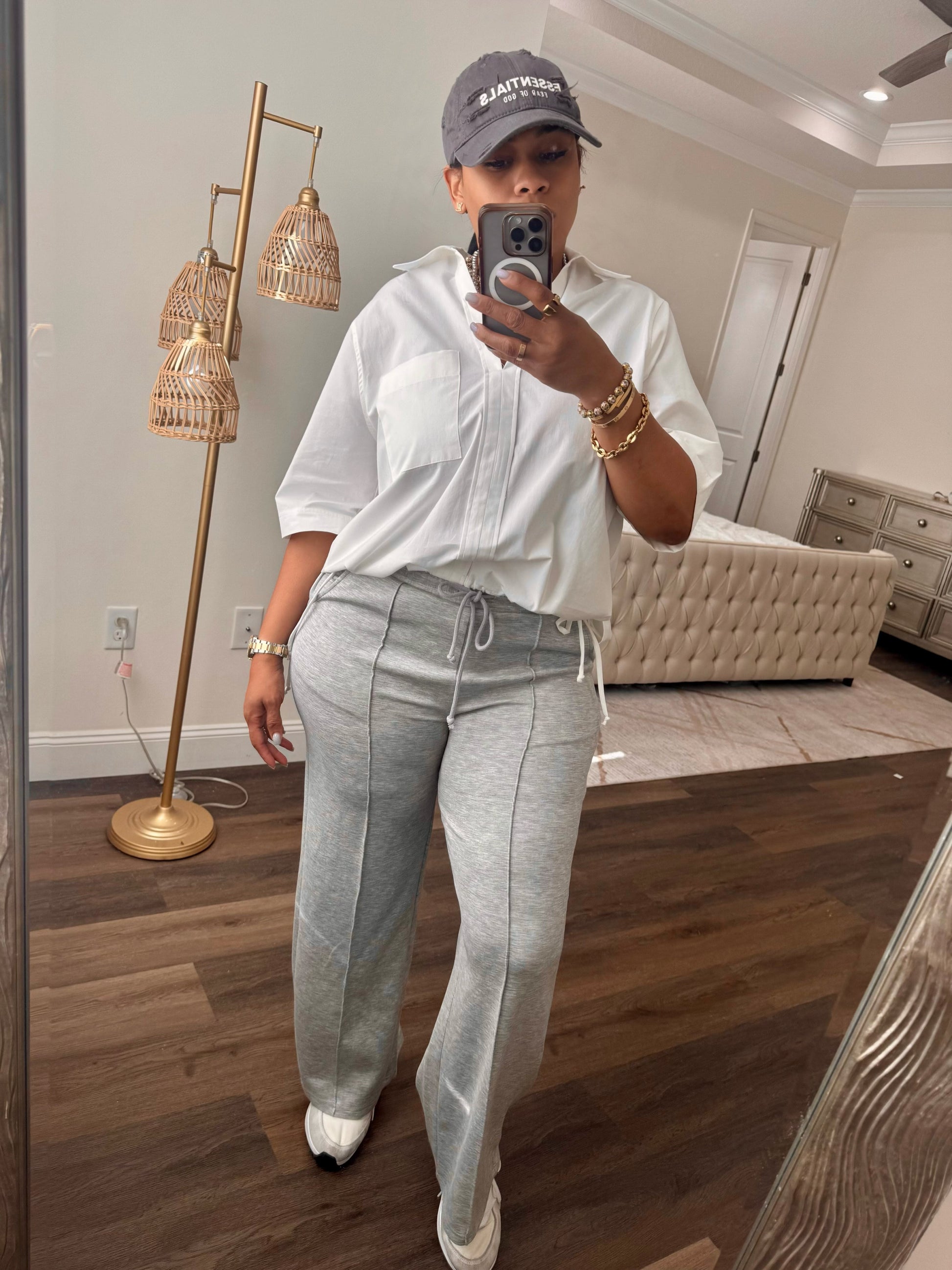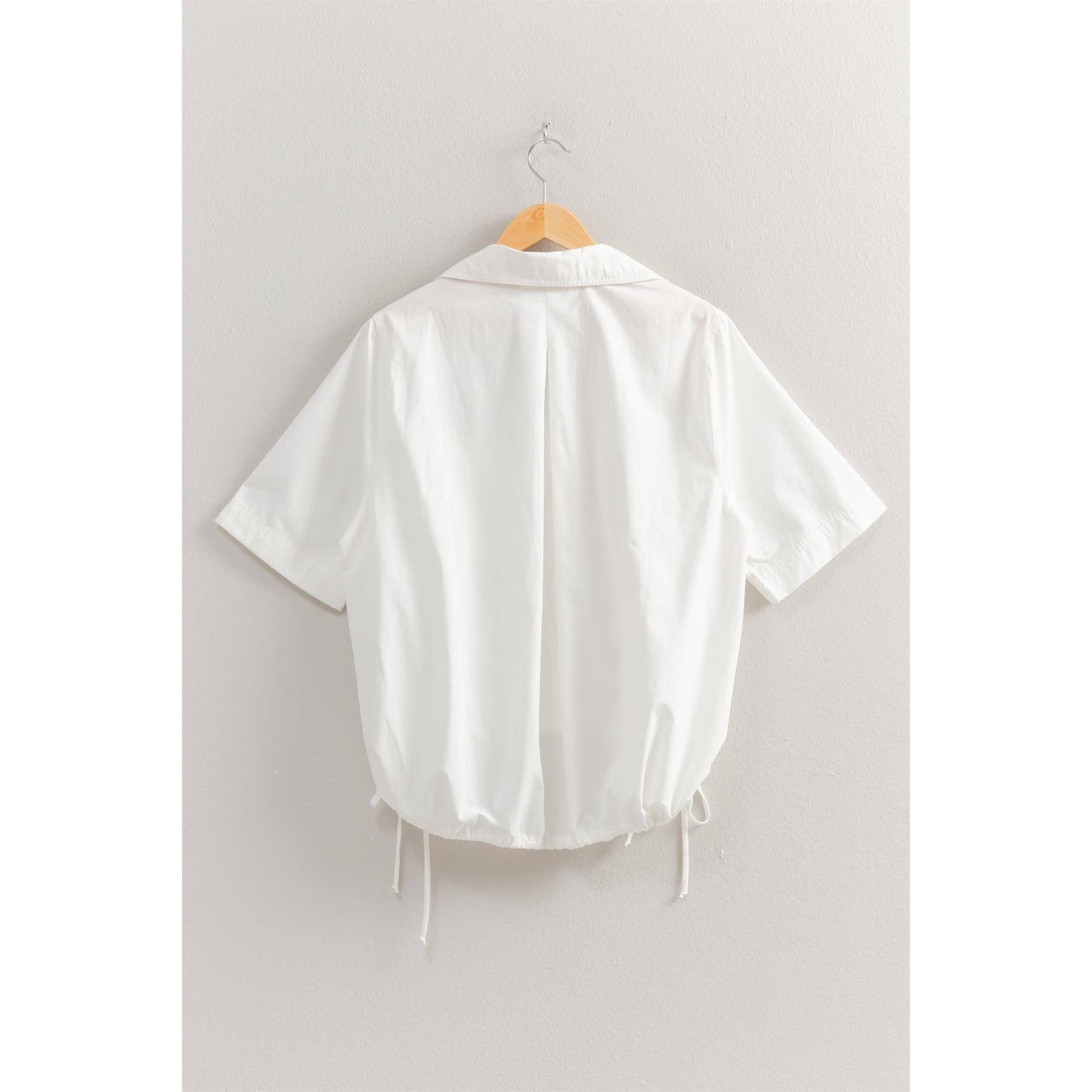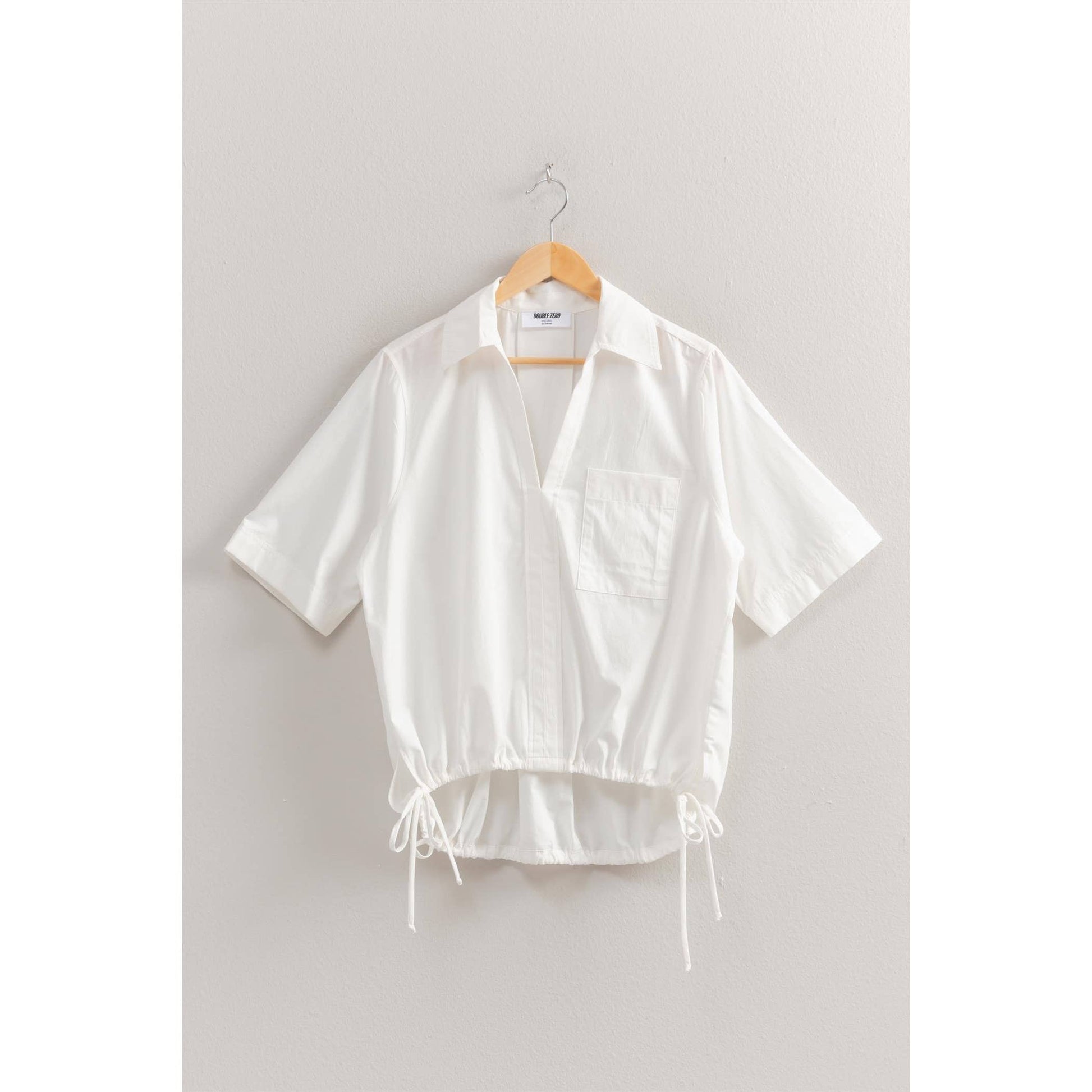 Stay on-trend with our Bubble Hem Relaxed Fit Shirt. This classic polo neckline and short sleeves provide both comfort and style. The side tie detail creates the popular bubble hem look, while the 100% cotton fabric ensures ultimate comfort. Available in multiple sizes, including medium worn by our model.