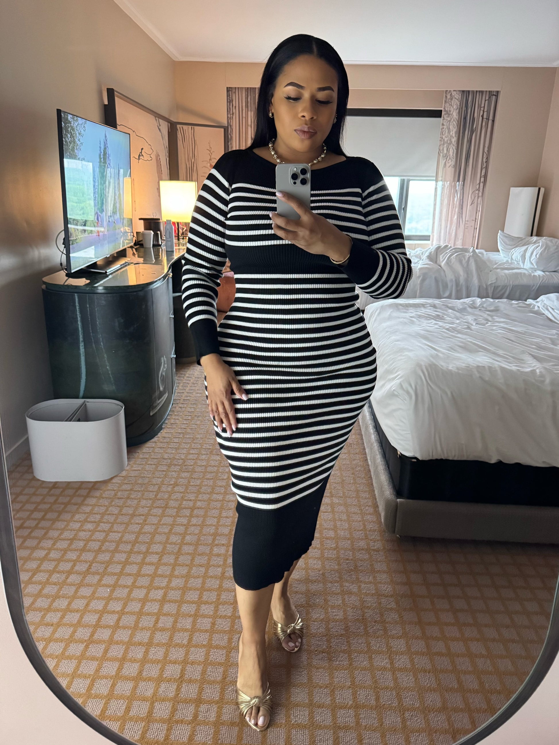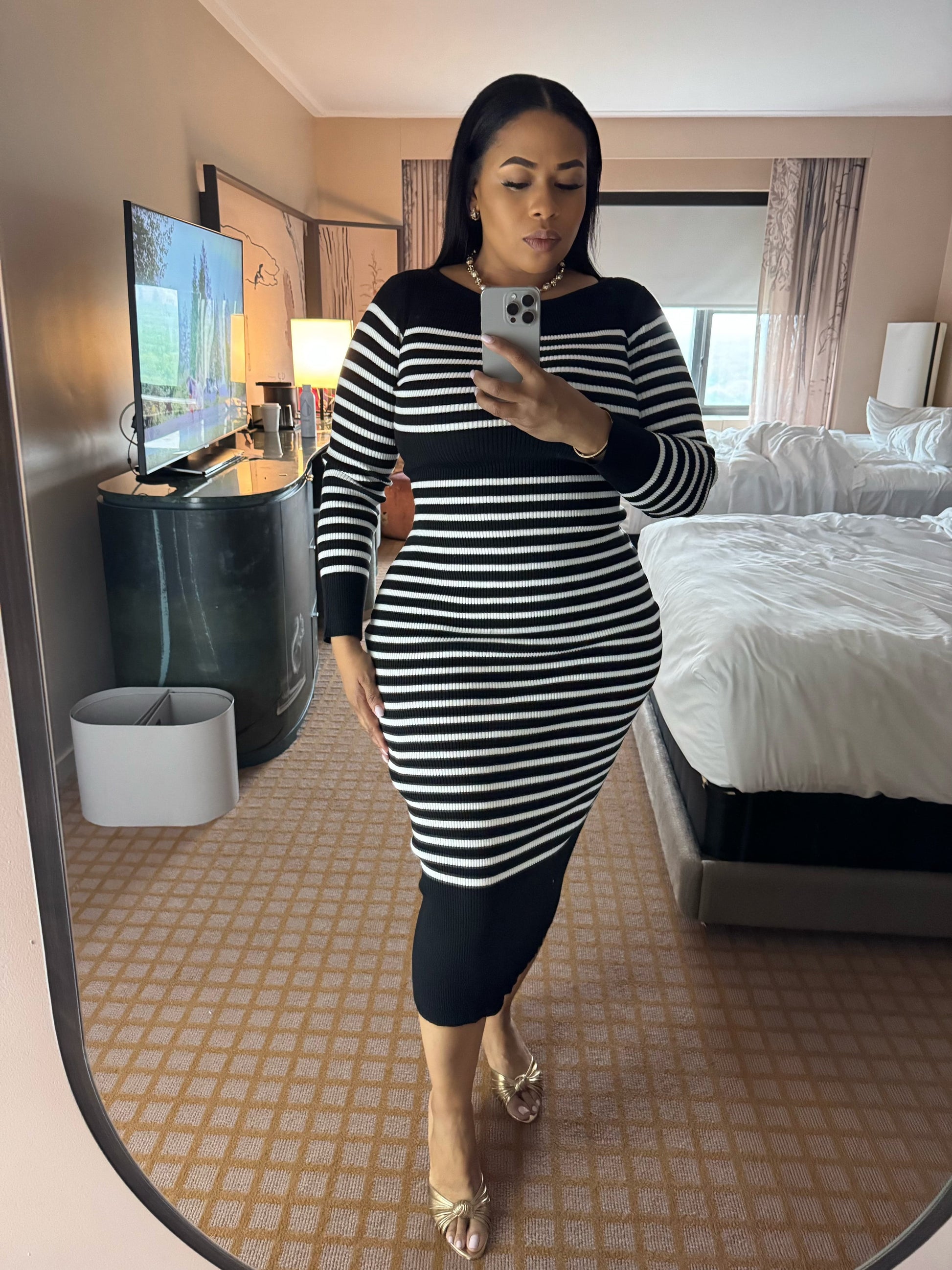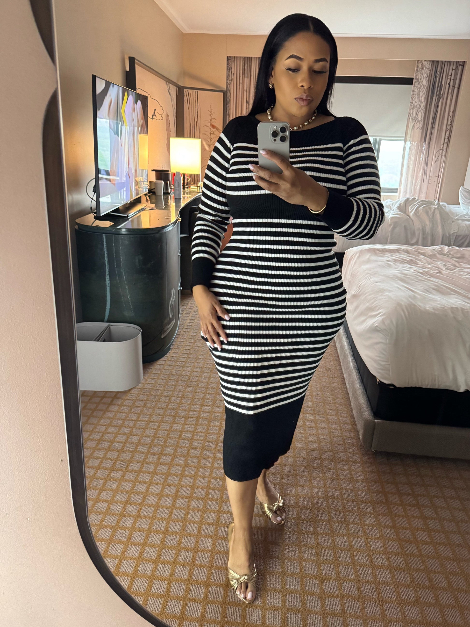 Crafted to showcase effortless style and comfort, this versatile STRIPE BOAT NECK SWEATER MAXI DRESS is the perfect choice for any occasion. The stretchy fabric and flattering boat neck design makes it suitable for all body types, and the timeless stripe pattern adds a touch of elegance. Available in multiple sizes, you can easily find the size that fits you best. Model is wearing a size small.