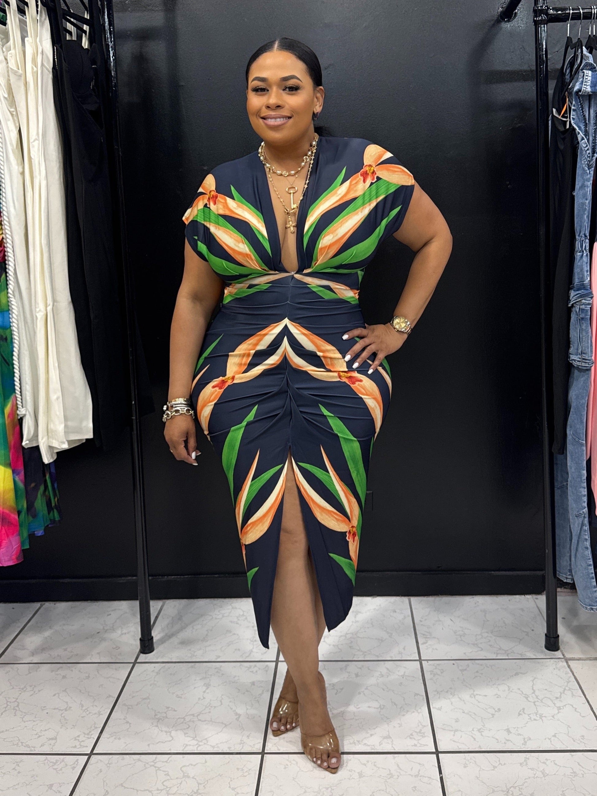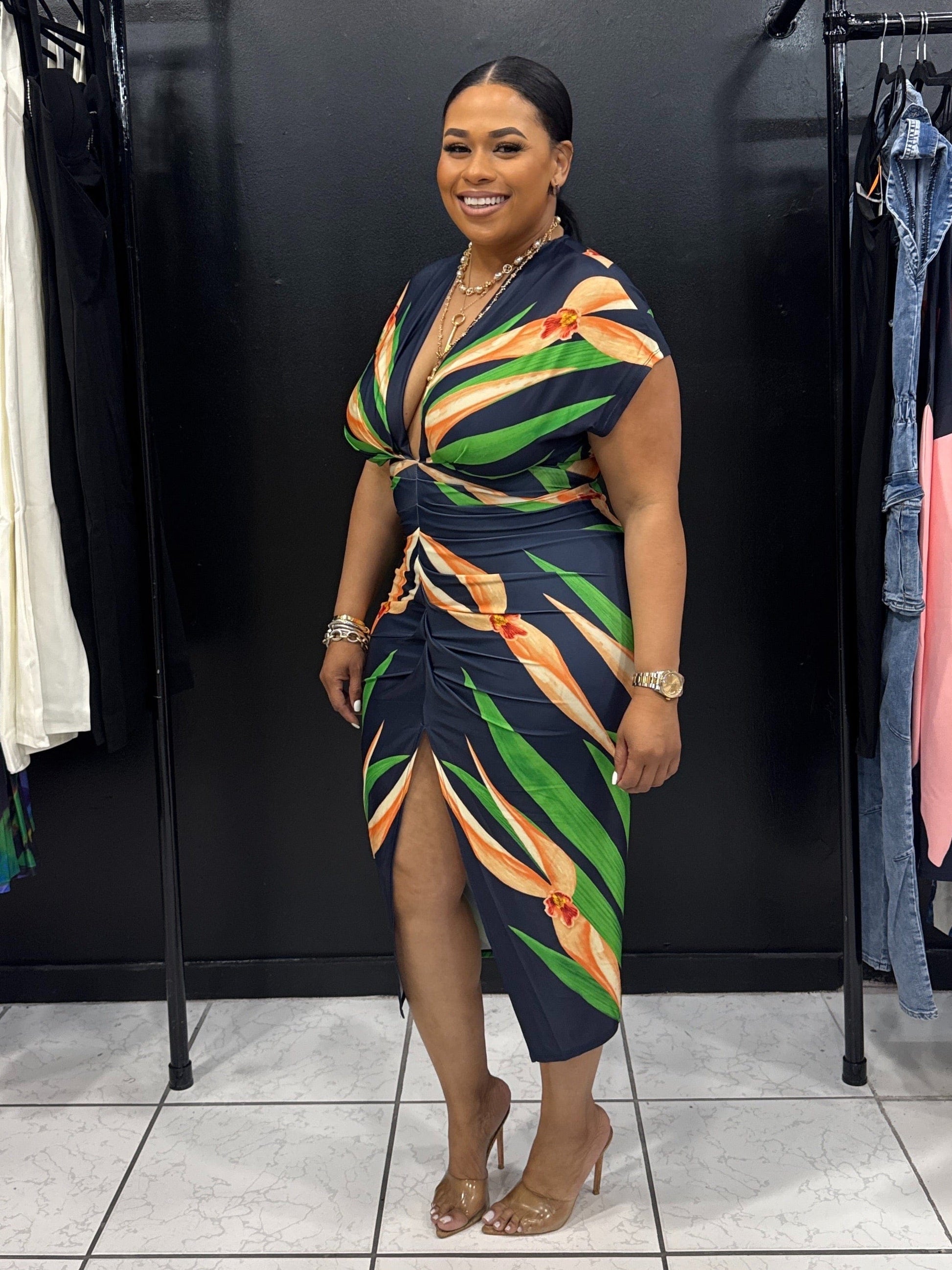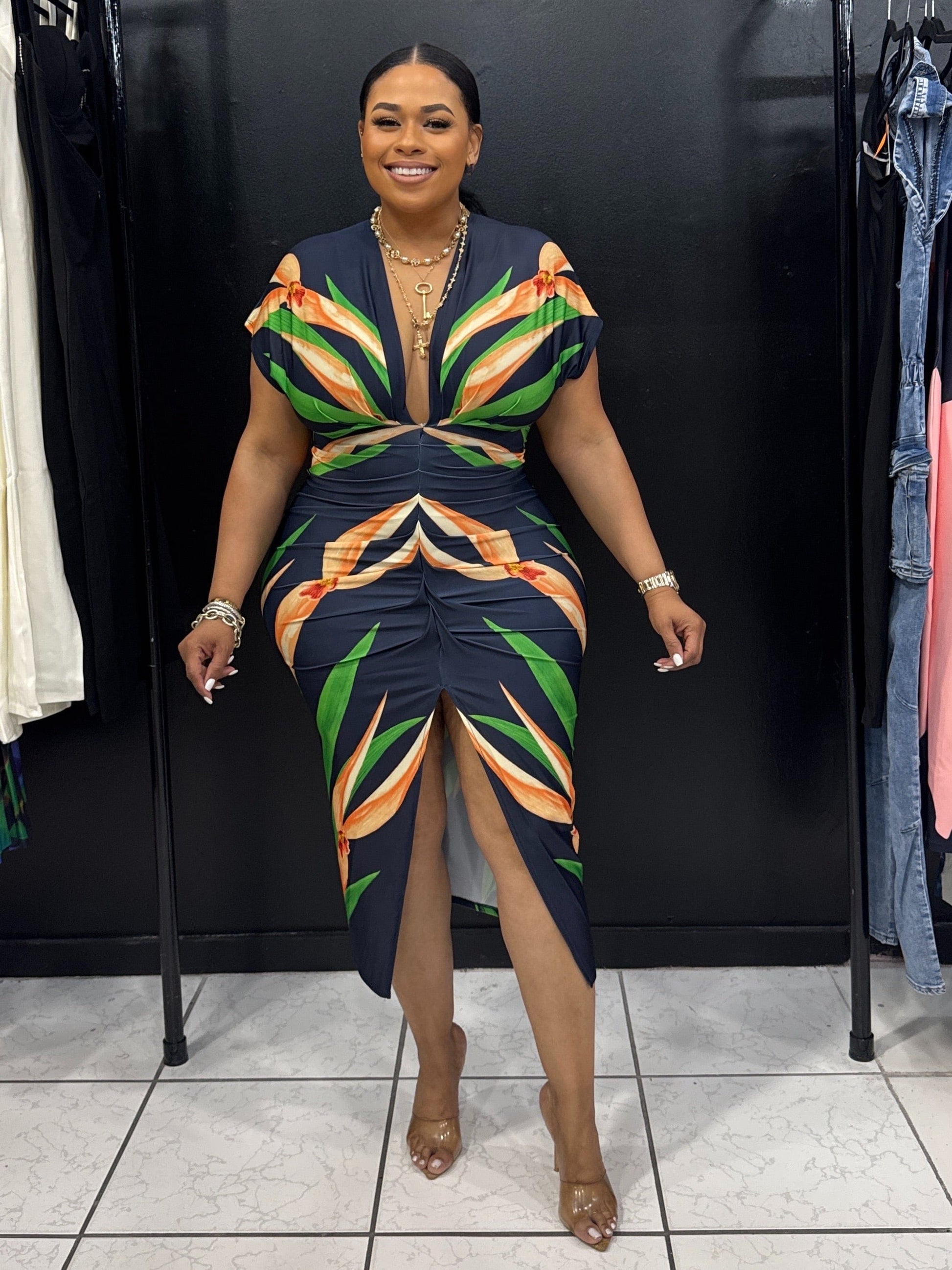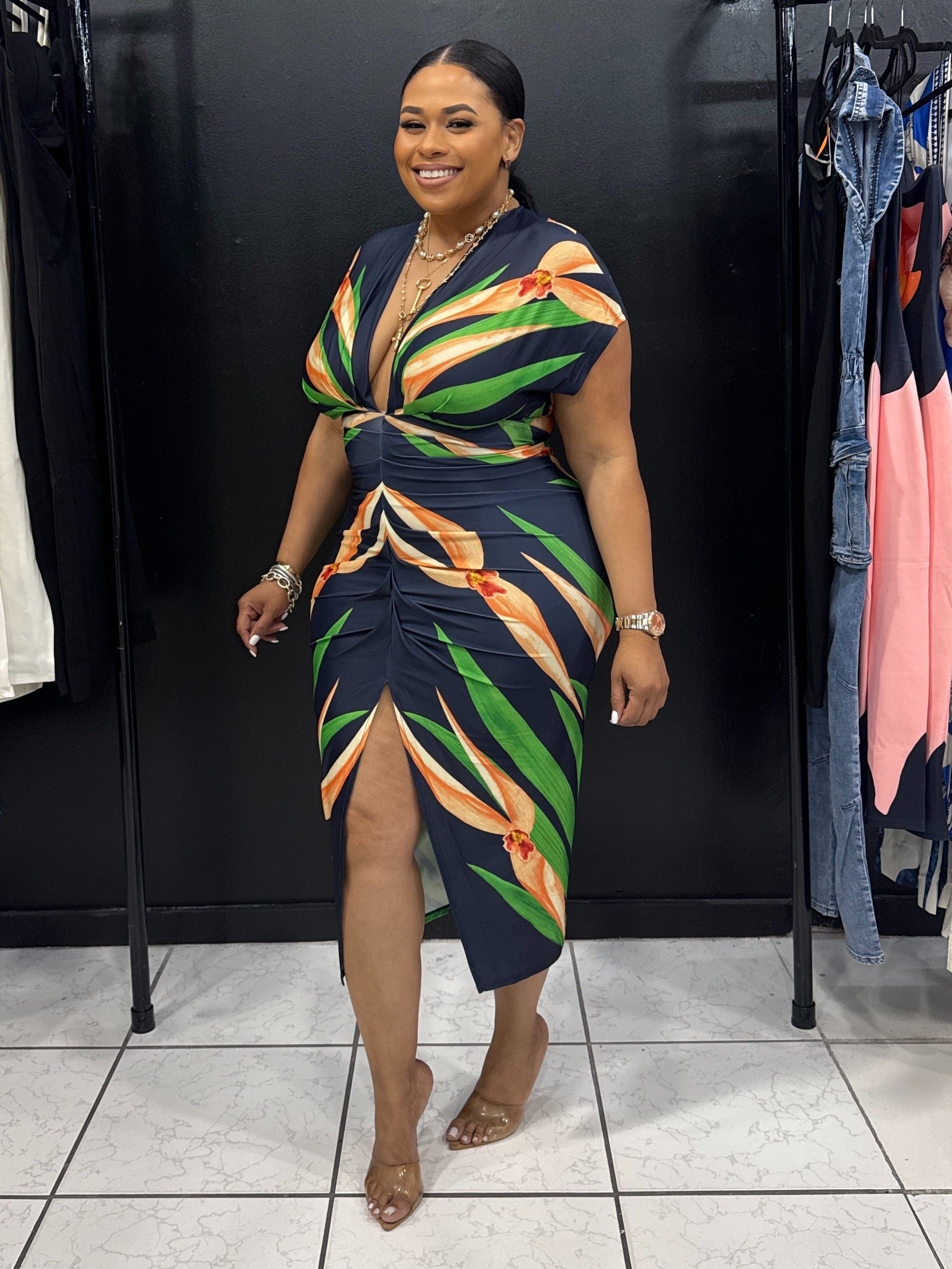 This midi dress is designed with a deep V-neck, perfect for showing off your assets. The floral effect print adds a touch of elegance, while the front pleated draped detail creates a flattering silhouette. Look and feel confident in this dress, made from stretched soft jersey fabric.