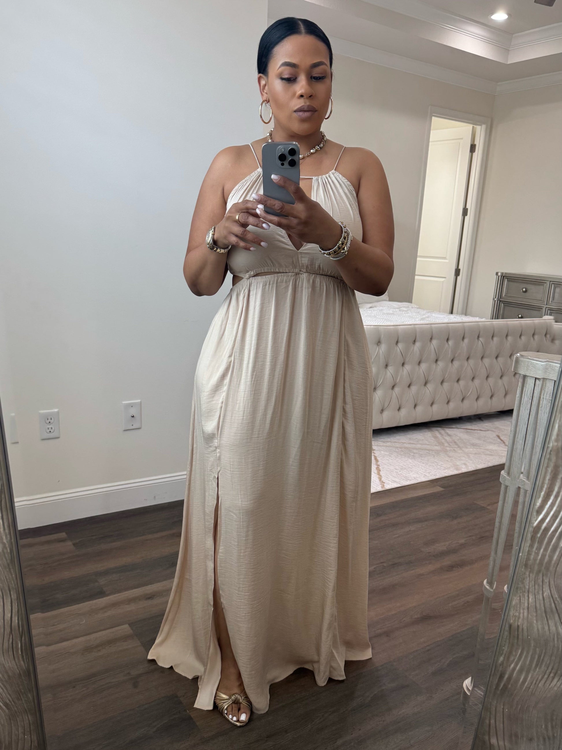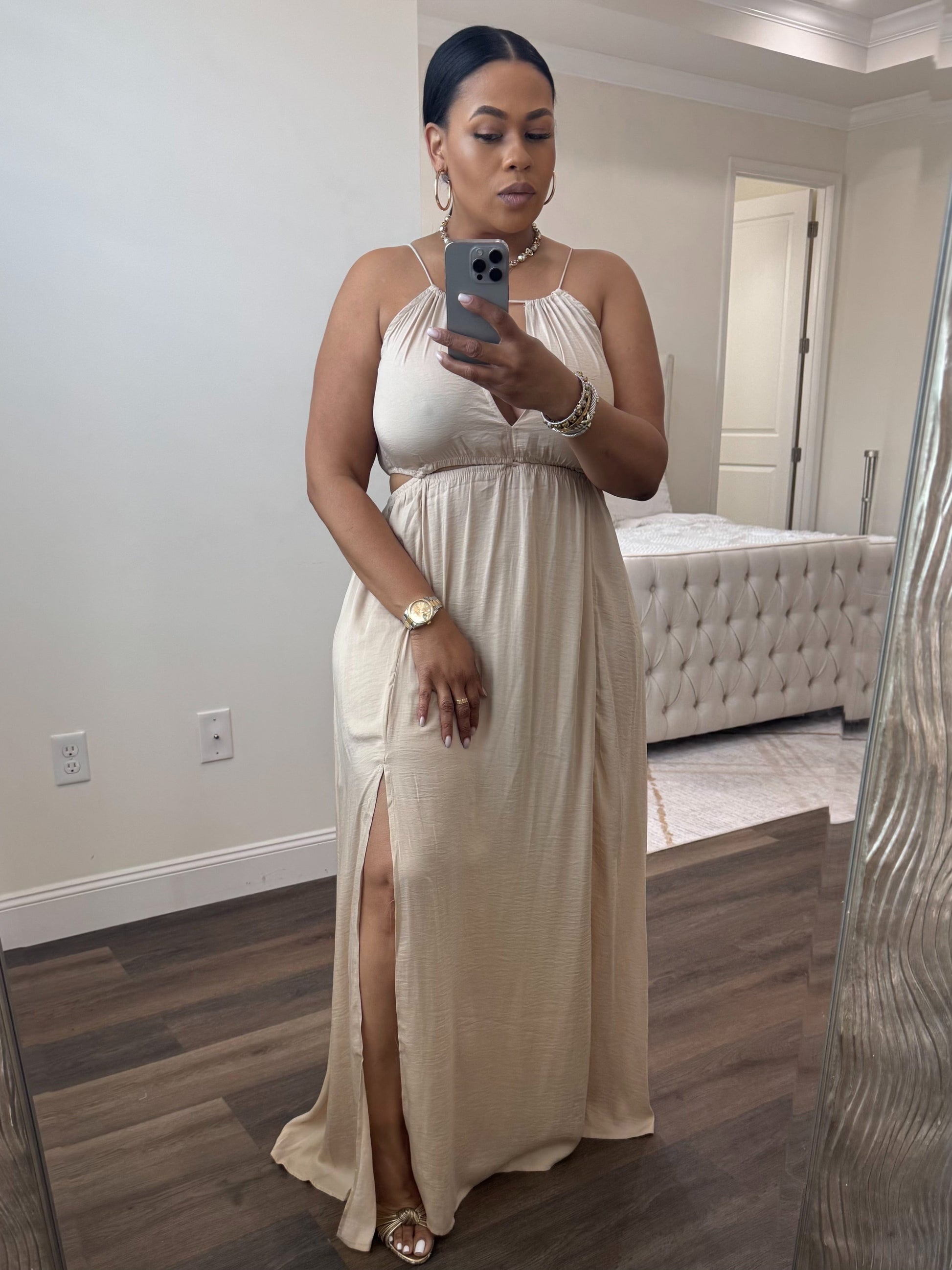Step into summer elegance with our Side Cutout Side Slit Maxi Dress in Tan. Perfect for garden parties, this dress features dainty shoulder straps and a sleeveless cut bodice with waist cutouts for a touch of sexy. The attached flowy maxi skirt adds a feminine touch. Elevate your summer style with this pretty dress.