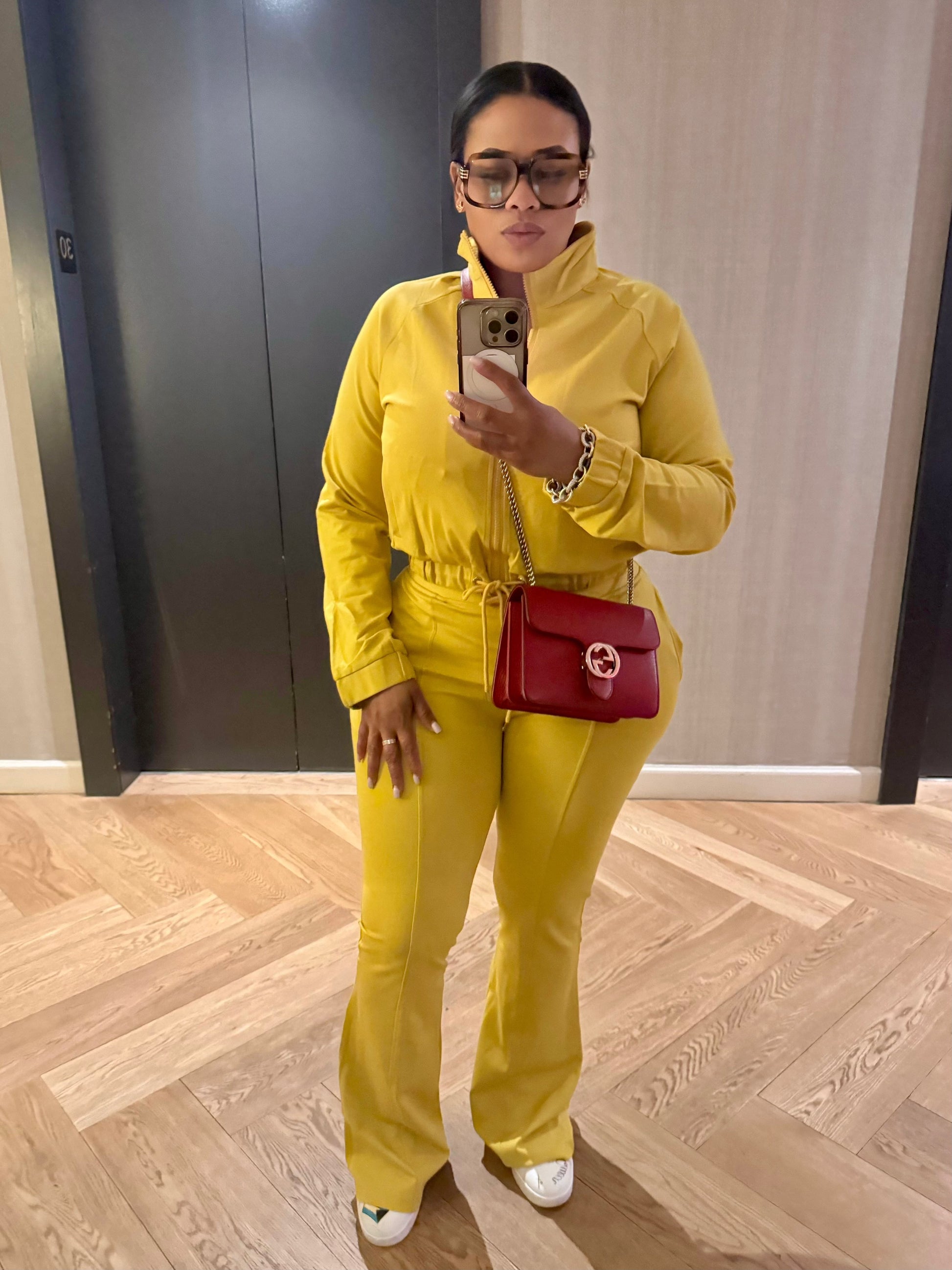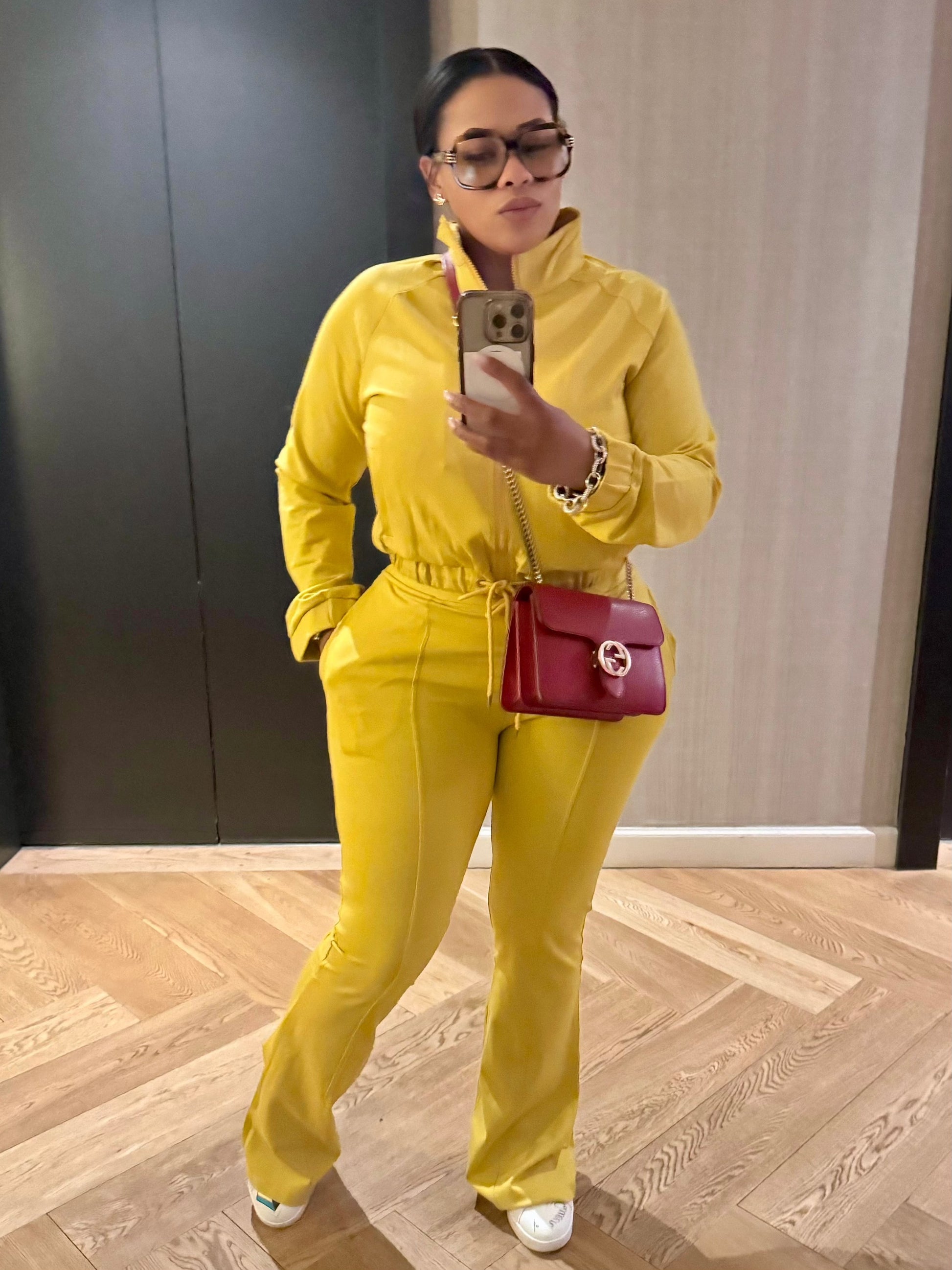 This set includes both flared track pants and a track jacket with a zipper and drawstring, featuring stretchy premium materials. It is both fashionable and versatile, making it a must-have for your wardrobe. Model is wearing a size large. Pair with sneakers or heels to elevate the look.