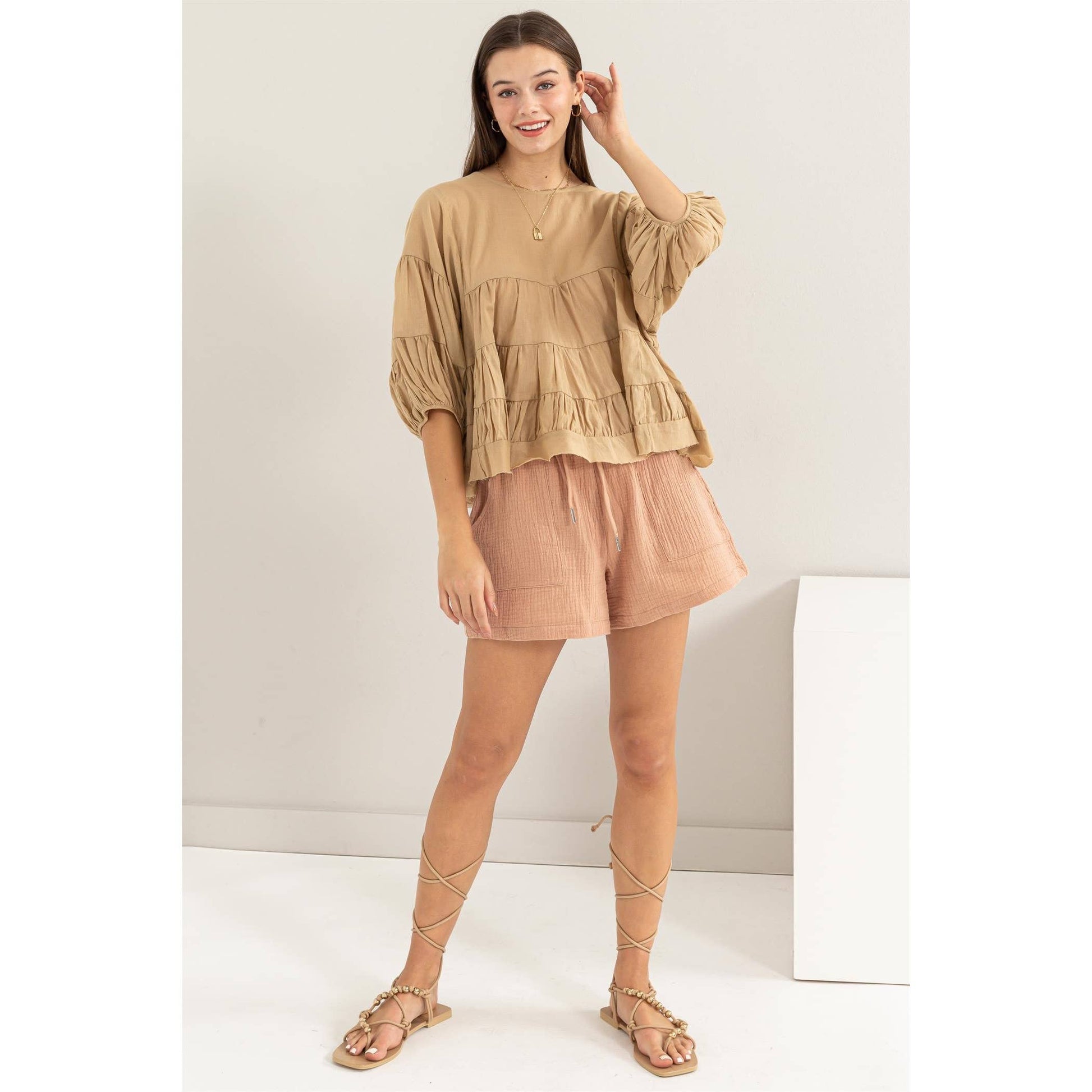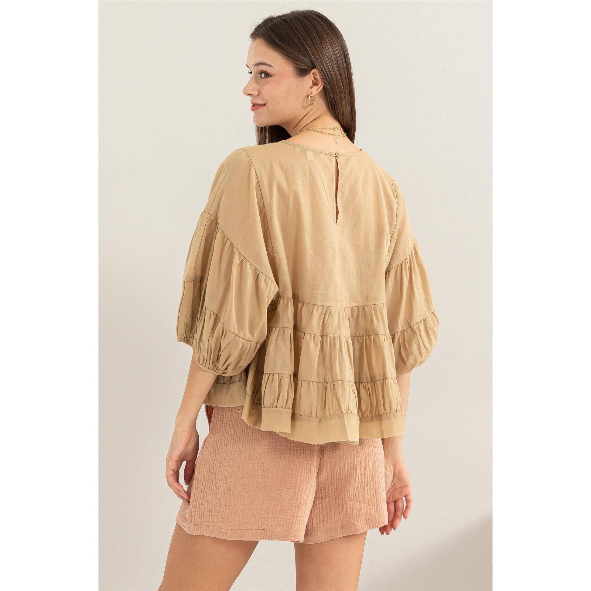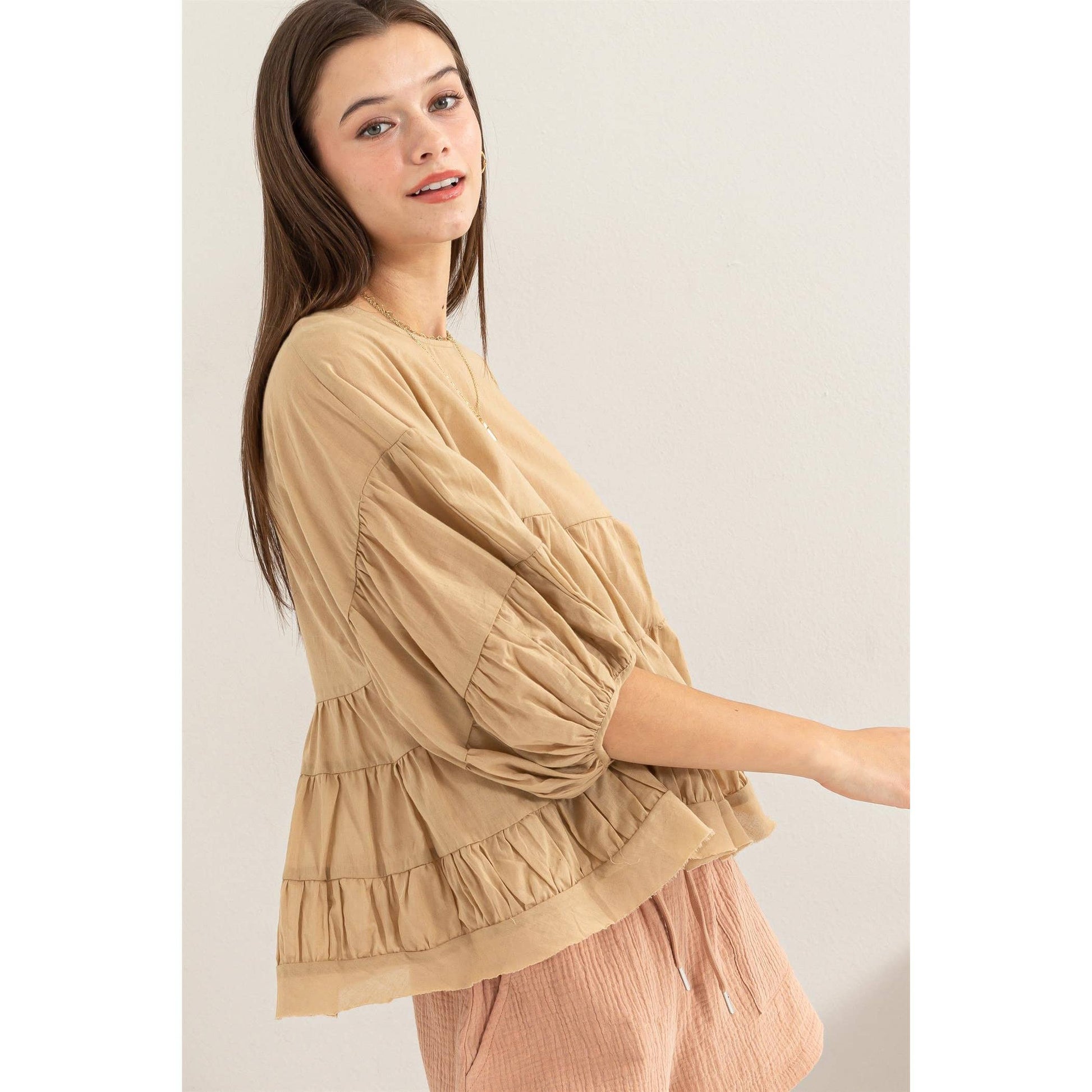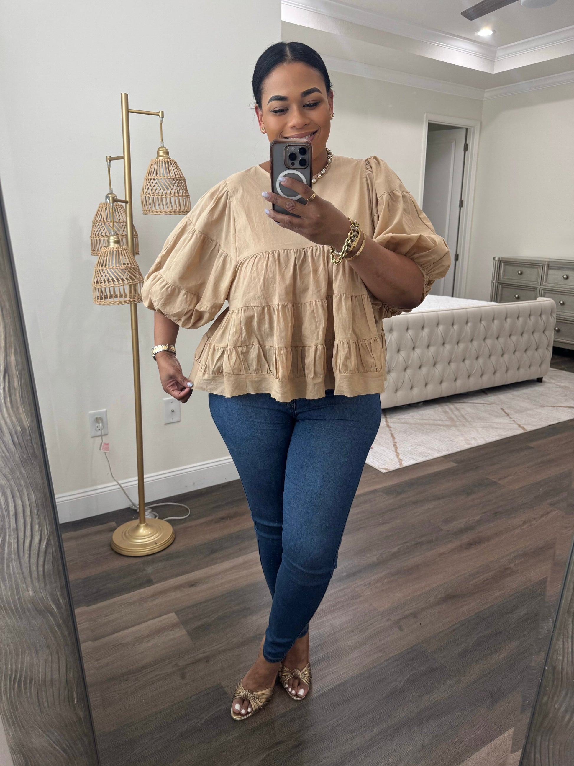 Introducing our Pure Love Babydoll Blouse in khaki. Dress up any outfit with its relaxed fit, crew neck, and breezy tiered style. The tiered puff sleeves add a touch of elegance while the cinched cuffs provide a comfortable fit. Perfect for receiving countless compliments.