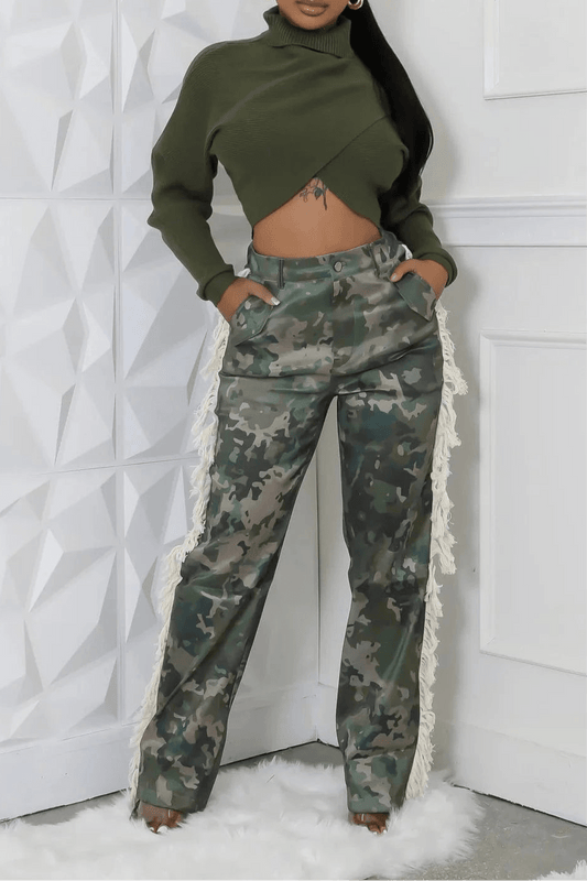 Rhinestone Slit Thigh Animal Print Jeans (Brown)