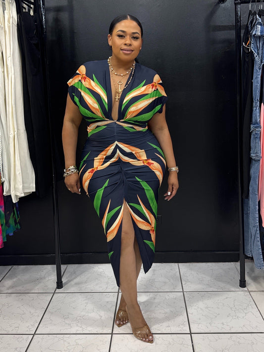Printed deep V-neck pleats midi dress (GREEN/NAVY)