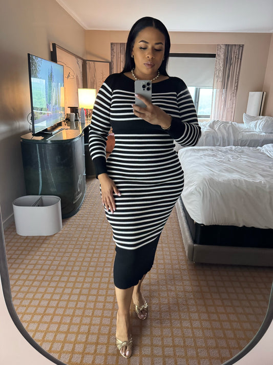 STRIPE BOAT NECK SWEATER MAXI DRESS BLACK-OFF WHITE