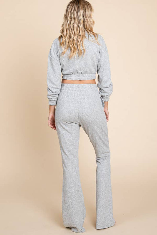 CROP ZIPPER FRONT BELL BOTTOMS CASUAL SET (HEATHER GREY)