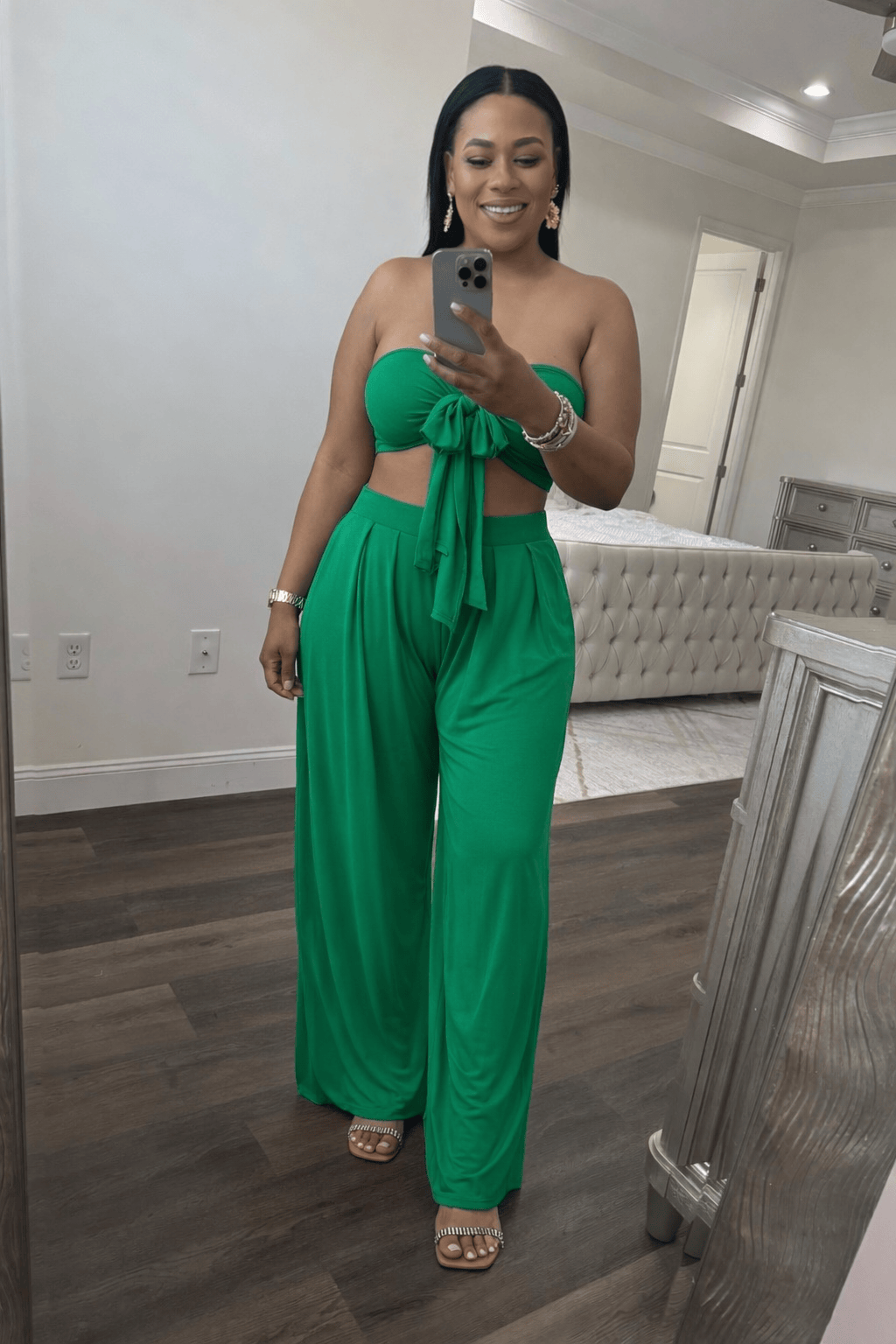 Paired with flowy, high-waisted wide-leg pants that drape beautifully over the body, this set delivers comfort, movement, and undeniable elegance.
