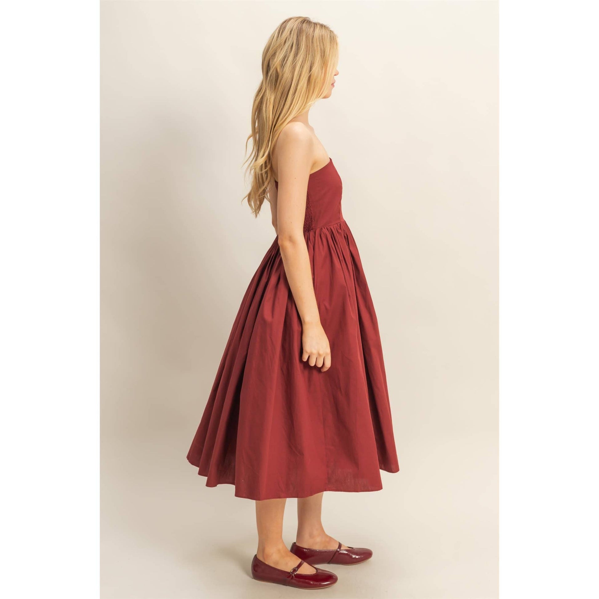 This Stunning Midi Dress Offers A Flawless Blend Of Sophistication And Captivating Allure, Perfect For Special Occasions Or Evenings Out. The Garment Features An Impeccably Tailored Bodice That Contours The Figure Gracefully, Transitioning Into A Voluminous Gathered Skirt That Adds A Dynamic Element Of Movement. Its Silhouette And Structure Create A Balance Of Classic Elegance.
